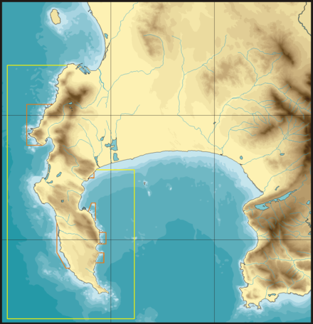 The steep eastern side is bordered by False Bay, and this stretch of coastline includes the smaller Smitswinkel Bay, Simon’s Bay and Fish Hoek Bay, where a strip of low ground extends between the coasts on both sides. At Muizenberg the coastline becomes relatively low and sandy and curves east across the southern boundary of the Cape Flats to Gordon’s Bay to form the northern boundary of False Bay. From Gordon's Bay the coastline swings roughly south, and zig-zags its way along the foot of the Hottentot’s Holland mountain range to Cape Hangklip which is at nearly the same latitude as Cape Point. The highest peak on this side is Kogelberg at 1,269 m.