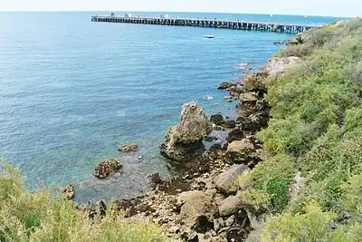 The jetty extends in an easterly direction for about 170m from the end of Edith Street. Its width starts at about 7.5m and widens to about 11m at about 75m from the shore. The seabed under the jetty falls from about 2 m depth at the entry point to about 6m at the west end. The seabed under the jetty is white sand littered with discarded structure left over from periodic maintenance and other rubbish. All of these materials are largely covered with invertebrate animal life such as sponges and ascidians. On the north side of the jetty, the seabed has been dredged to a depth of at least 8m for the length of the wider section of jetty to permit large vessels to moor alongside the jetty. To the west of the end of the jetty, there is rock strata that has exposed by the dredging process as well as the remains of jetty piles from a time when the jetty was longer. The seabed around the jetty is covered with either seagrass or other marine plants.