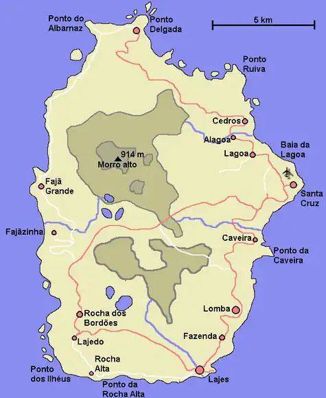 From Santa Cruz, a roadway faces south, bordering the eastern and southern coast and then returning to the main town along the hinterland. The list of POIs along the route and its branches: Gruta dos Enxaréus, Caveira, Lajes das Flores, Lagoa Funda and Lagoa Rasa, Rocha dos Bordões, Fajãzinha, Cuada, Fajã Grande and Morro dos Frades.