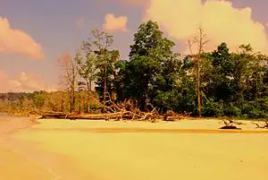 - 🌍 Elephant Beach (A path to the beach starts from the road to Radhanagar ; look for a dip in the road on a curve where there will usually be a few motorbikes parked. Several paths head off from this point, ask around for the correct one. If you choose to trek alone through the forest then stick to broad path since there are forks along the way. The walk is about 30 minutes at an easy pace with dry weather.). * Elephant Beach is further north from Radhanagar and is popular with Indian tourists. The shoreline here was largely swept away by the 2004 tsunami and the beach is a fraction of what it used to be; however, the coral here is probably the best on the island, making this an excellent spot for snorkeling. It's reachable on foot from Beach #7 or by fishing boat from the east side of the island; many resorts arrange snorkeling and diving trips here. Since the tsunami, the path ends in an expanse of uninviting looking swampy water. Rather than attempting to go around, wade straight through it — the beach is only 100 meters straight ahead, the water is rarely above knee-height and the ground is solid. As you enter the swamp, you would see a small red board ahead, to your left; bear towards it. Wear sandals when crossing to avoid sharp shells. During high tide, water may be a foot deeper in last 6 metres or so. While snorkeling, keep an eye out for the glass-bottom boats. If trek and get to the beach and are tired to trek back an option would be to take a boat ride from there to jetty, normally they charge ₹100 per person, only challenge is finding someone who is willing to take you and then take an Auto ride for ₹100 again to the point where the vehicle is parked.Radhanagar Beach in the late afternoon