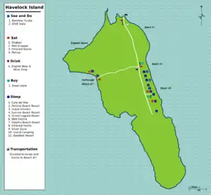 Havelock Island (Hindi: हैवलॉक द्वीप, Malayalam: ഹെയ്വ്ലോക് ദ്വീപുകള്), now known officially as Swaraj Dweep (Island of Freedom), is the most visited of the Andaman Islands. It's becoming popular for its beaches, laid back atmoshere and great scuba diving.