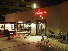 - 🌍 Uusi Sauna, Välimerenkatu 10. Tu-Sa 16:00-00:00, closed Su M. A stylish and spacious public sauna and bar in Jätkäsaari. Separate saunas for men and women. You can bring your own towel or rent one from the bar. The bar has a diverse selection of drinks and you can bring your drink to the dressing room (not to the actual sauna though). The bar has live music playing on special event nights. Sauna €18, beer around €10.