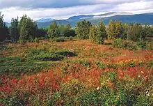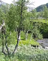 At lower altitudes, but above the tree line, there is often an easy to walk fell heath. This is the typical terrain in the "low fells" (lågfjäll), such as in the very north of Finland and between the high mountains and the forests in Sweden. Wet terrain near the tree line is often thickly covered with willow (Salix) shrubs, quite onerous to get through. Valleys are often forested, primarily with fell birch, but also some spots with pine and a bit lower still, pine and spruce forests.