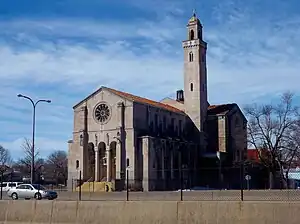 Continue eastward down Stanislaus Street (or, if you parked in the church lot, exit right onto Kosciuszko Street then turn left on Stanislaus). Turn left at Lathrop Street then right onto Sycamore Street, passing under the Belt Line Railroad and out of old Polonia. Four blocks past the railroad overpass, you'll find the next stop on our tour. A great vantage point to see this church is from in front of the striking midcentury-style Providence Funeral Home on Sycamore; if you don't want to park on-street, there's a fenced lot behind the building.