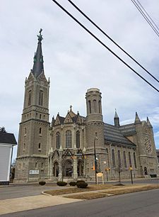 - Our Lady of Lourdes' design is an interesting one, executed by the local firm of A. E. Minks and Sons in a hybrid style that incorporates elements of the Romanesque and the Gothic: while the former is represented by the round arches that dominate the rusticated Medina sandstone façade and the overall stout, ponderous appearance of the building, the steeply pitched roof and the finials that sit ubiquitously atop the roof gables, dormer windows, and spires are more suggestive of the latter school. The Main Street side of the church features two distinctive asymmetrical spires, the taller of which is crowned by a steeply-pitched octagonal cupola with an open-work lantern on top, and once boasted niche statues of St. Peter and Our Lady of Lourdes made of imported Italian marble. Those handsome decorations, along with the matching hand-carved marble altar, full-relief Stations of the Cross, and exquisite interior murals, are all now lost—as are the majestic stained-glass windows, now boarded up.