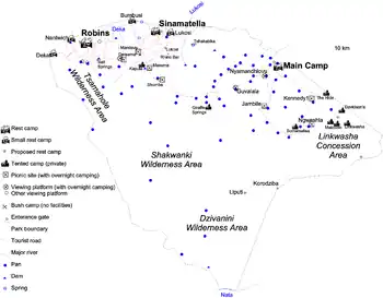 Most of the traveller facilities are in the north (Main Camp, Sinamatella, Robins Camp); the south and southwest portions of the park are wilderness areas with no roads or travel infrastructure.