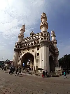 - 🌍 Charminar (take an auto (₹25) or walk from Yakutpura HF FL (about 25 minutes)). M–Sa 9AM–5PM, closed on F 1–2PM for prayers. Literally "four minarets" (char means "four" and minar means "minaret"). Quli Qutb Shah built the Charminar in 1591 at the very spot at which he prayed to end the plague epidemic. The Charminar, made of pulverised marble, limestone, mortar and granite, has long been the icon of Hyderabad. The towers rise to a height of 48.7 m (160 ft) above the ground. It has 140 steps. Graffiti on the walls have diminished the beauty of the Charminar. There is a mosque with 45 prayer spaces located inside in the upper storeys. The structure stands in the middle of a busy road. The traffic has been stopped and the area is pedestrian access only. Atop the minarets, you get a panoramic view of Hyderabad; to reach the top of the monument, there are 149 winding steps to the upper floor. At the very bottom of one of the minar, there is a Hindu temple. The traffic is terrible. Plan an early morning trip around 9AM if shopping is not on the to do list. There is a separate entry way for foreigners. ₹25, Children below 11 free (for Indians), ₹300 (for foreigners), video cameras are charged ₹25 extra.