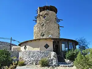 - π Desert View Tower - Just off I-8 (In-Ko-Pah Road, exit 77) on the eastern edge of the county, at the Imperial County border, is this stone tower dating back to the 1920s. Once a stop along the then-treacherous journey between San Diego and Yuma, Arizona, today it is a museum with artifacts from the tower's history, offering a scenic view of the desert to the east and holding a collection of boulders crafted into beautiful carvings.