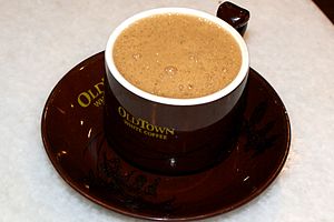 Ipoh white coffee was invented here: to reduce the bitterness of coffee roasted in the European style without adding sugar (as during the roasting of Kopi-O), beans are roasted with palm-oil margarine. The result is a mild tasting kiddies' version of what westerners would call real coffee. A few genuine Chinese coffee shops that sell Ipoh white coffee are located opposite the Kinta Heights flats in the old town.