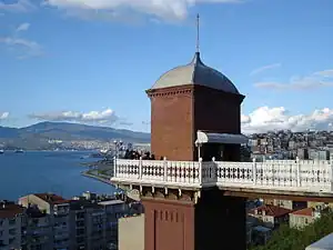 - 🌍 Asansör (Elevator), Şehit Nihatbey Cd, ☏ +90 232 293 4780. Daily 06:00-00:00. This lift was constructed in 1907 by Nesim Levi Bayrakoğlu, a Jewish businessman, to carry people and goods between Karataş waterfront and the properties on the hill. It has two cars each taking about ten people on a 58 m lift, and originally was water-powered; from 1985 both are electric. The restaurant at the top has a bird-eye view of Izmir. The street at its base is also known as Darío Moreno Sk for the singer who once lived there, David Arugete (1921-1968). It's tragic that, having dwelt so long by a free lift, he died young in a strop when he came late to an airport boarding gate and was denied boarding. Free.