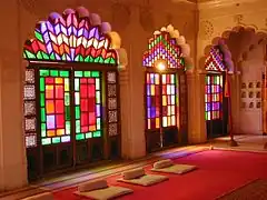 - Moti Mahal. (Pearl Hall). Pearl-coloured inside and decorated with coloured glass windows, this is where the Maharaja held his audiences, with the five alcoves on the far wall allowing his queens to listen.