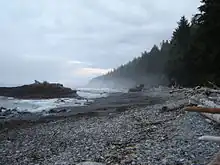 As its name implies, the Juan de Fuca Marine Trail follows the coastline of Vancouver Island. Primarily second-growth trees, there is the occasional old-growth. The coast is rock--often sandstone--carved into shape by the ocean. Beaches are primarily pebble or rock, although some, like Sombrio, are sandy.