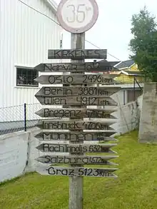 Kirkenes is a town in the Finnmark region of Norway, far east near the Russian border, more or less in the end of mainland Norway. This is the last port for Hurtigruten and the end of Norway's main road E6, 2,500 km (1,600 mi) from Oslo and 3,120 km (1,940 mi) from Trelleborg (Sweden).