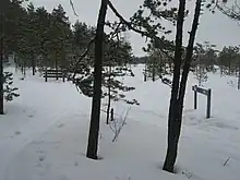 In wintertime there are marked skiing tracks over the bogs. Maintenance is not guaranteed; do not rely on the tracks soon after snowfall. The summer trails can be difficult to use in winter. The distances are comparably short, so snowshoes are usable (but do not walk in the skiing tracks).
