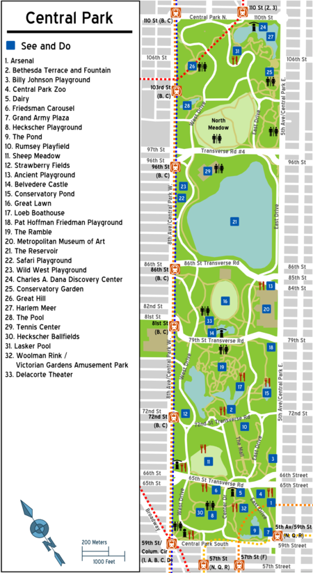 - On foot. Central Park is a haven for people looking to walk, hike, stroll, or jog. The entire park is friendly for hiking and strolling, with many hidden corners and a variety of terrains to explore. Speed walkers and joggers have three ideal spots in the park: the Park Drives, which circle the park and have a special lane for joggers; the Reservoir, which has a very well-used trail surrounding it; and three separate bridle paths, one adjacent to the Reservoir, one at the North Meadow, and one at the southern side of the park, all of which are loops that extend about 1β1.5 miles. The Central Park Conservancy operates guided walking tours year-round ($25 adult); check the website for details.