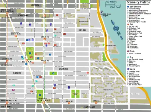 In the shadow of the skyscrapers of Midtown sit some of Manhattan's most colorful and vibrant neighborhoods. Busy Flatiron is one of the borough's most active shopping and entertainment districts, situated between Union Square and Madison Square Park, two of the most popular meeting places for Manhattanites. Just to the east is quiet Gramercy, a residential neighborhood centered around the park of the same name and holding some of the most pleasant streets in Manhattan. North of Madison Square Park, the bustle of Midtown spills over into this historic neighborhood, filled with shops and grand old buildings.