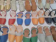 Avarcas, the traditional Menorcan sandal, is available in shops and markets throughout the island. They are now a fashion icon and can be found around the world, but were originally designed as a shoe for farmers. Only the original Avarca manufacturers are allowed to sell shoes with the label "Avarca de Menorca". This is only given by the local Balearic Government as a guarantee that the avarcas accomplish minimum quality standards and that they have been really manufactured on the island.