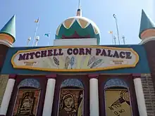 - 🌍 Corn Palace, 604 North Main, ☏ +1-800-289-7469, toll-free: +1 605-995-8430. Memorial Day through Labor Day: 8AM-9PM Daily; Hours may vary during the Corn Palace Festival. Rest of year: 8AM-5PM. The original palace was built in 1892 in order to display the fertility of South Dakota's soil. The current building is the third incarnation and was built in 1921. Each year a new mural designed by local artists related to life in South Dakota is created on the exterior of the palace. The murals are created from a lot of corn, grasses, grains, straw, oats, etc. Inside the palace there is a stage and arena for sporting events. Each year there is a Corn Palace Festival that takes place in front of the Corn Palace. Free.