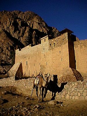 The Monastery of St. Catherine (دير سانت كاترين, Dair Sānt Kāt(a)rīn), at the foot of the mountain, is the easier of the two destinations here. Looking more like a fortress than a church, access is through a massive iron gate shut for the night and opened in the morning from 9AM to noon only (daily except Friday and Sunday). Note that the monastery observes the Greek Orthodox rites and is thus also closed for Christmas and Easter as calculated by the Greek Orthodox calendar. It was declared a UNESCO World Heritage site in 2002.
