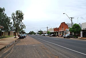 Mungindi is a town (population 747 in 2016) on the Barwon River, straddling the New England region of New South Wales and the Darling Downs region of Queensland in Australia. Unusually, it is one of the few towns around in Australia where it's located in two jurisdictions, unlike other cities like Albury-Wodonga where they're considered as "twin-cities".