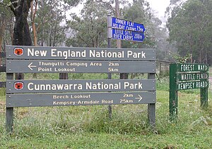 - New England National Park and Cunnawarra National Park are two world heritage parks, as part of the Gondwana Rainforests of Australia about 70 km from both Armidale and Dorrigo. They both feature excellent beech forests, though New England is the larger of the two with the main highlight of Cunnawarra being a beech lookout. Requires a gravel road to get into, but still 2WD accessible.