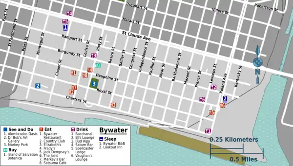 It is a very pleasant stroll down Royal, Dauphine, or Chartres Streets through the historic Faubourg Marigny; approximately 10 blocks from Esplanade Avenue (the downriver limit of the French Quarter) to the Bywater.