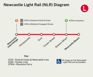 Newcastle Light Rail (NLR) connects Newcastle Interchange (connected to the train station in a seamless manner β simply walk straight ahead past the Opal gates from the platform) to Newcastle Beach passing Honeysuckle, Civic, Crown Street and Queens Wharf.