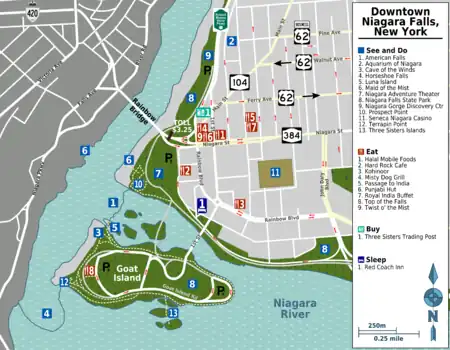 - π Seneca Niagara Resort & Casino, 310 4th St (between Niagara St and Rainbow Blvd), β +1 716 299-1100, toll-free: +1-877-873-6322. Casino and hotel complex with stores and restaurants, a short walk from the falls.