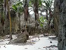 The island is approximately 73 km in circumference with two distinct terraces. The upper terrace, 60m high at its highest point, slopes steeply to a 0.5 m coastal terrace ending with high cliffs, some over 20m above sea level. A rugged fringing reef, which in places over 100 m wide, surrounds the island.
