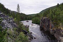 The trail toward Kilpisjärvi follows the Pitsusjoki River southward, passing the 🌍 Pitsusköngäs waterfall about 1.5 km past Pitsusjärvi Lake. The trail then veers away from the river near the gorge. Further along, the Vuomakasjoki bridge, built in 2022, replaced an earlier bridge destroyed by spring floods the previous year.