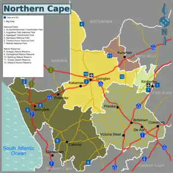| Green Kalahari Famous for Augrabies Falls, an awe-inspiring waterfall, and for the Kgalagadi Transfrontier Park, a desert landscape with migrating herds of animals and unending red dunes |