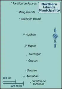 - Pagan — two volcanoes connected by a strip of land, uninhabited (most likely) since an evacuation forced by a 1981 eruption; has a grass airstrip