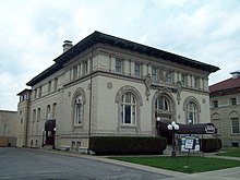 - π Temple B'Nai Israel, 127 S. Barry St.. Temple B'Nai Israel is a historic synagogue. It was built in 1929, and is a three- to four-story-tall, light brown brick structure with terra cotta decorative details. It measures 85 feet long, 42 feet wide, and 50 feet tall. The front facade features a massive arched terra cotta portal encircling a large, round stained glass window. The congregation was established in the 1880s.