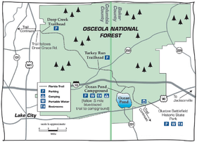 The Osceola National Forest is in the northeastern portion of Florida between Lake City and Jacksonville near the crossroads of I-10 and I-75 and the crossroads US 90 and US 441. It is located in parts of Columbia, Baker, Bradford, and Hamilton counties. The forest is headquartered in Tallahassee, but there are local ranger district offices in Olustee.