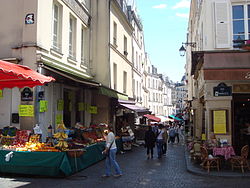 The lower end of rue Mouffetard as it runs away from the Panthéon hosts an ongoing fruit and vegetable market, and is lined with food and wine shops of all kinds.