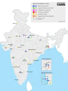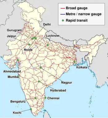 Major metropolitan cities in India have rapid transit systems, which are popularly known as "metros" in India. They have their own railway lines separate from the broad-gauge network. As of 2023, Ahmedabad, Bangalore, Chennai, Delhi, Gurgaon, Hyderabad, Jaipur, Kanpur, Kochi, Kolkata, Lucknow, Mumbai, Nagpur, Noida and Pune are served by metro systems. Except Kolkata, all other metros are not operated by IR. Delhi Metro is the largest metro system which connects to a few other cities nearby.