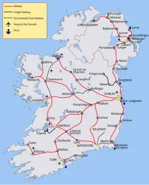 Also refer to individual city "Get in" sections for more detail. Irish railway stations are small by European and British standards, easy to navigate, and fairly central in town. This section describes all the ports of entry into the Republic and Northern Ireland because they involve a change of transport mode. Dublin, Belfast, Cork and Limerick stations have a couple of points to be aware of. The terminus stations of Waterford, Galway, Westport and Sligo pose no problems and need no further description here. In summary: