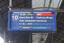 - Regular ICE (InterCity Express, German high-speed trains) from Zurich and Interlaken via Berne, Basel to Freiburg i.B., Offenburg, Baden-Baden, Karlsruhe, Mannheim, Frankfurt a.M. (main railway station or airport) in Germany, many continuing toward Cologne and Dortmund, or Hannover and Hamburg, or Berlin, or Amsterdam.