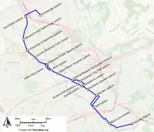 ION Light rail (route 301) serves major destinations, such as Downtown Kitchener, Uptown Waterloo, Conestoga and Fairway malls (northern and southern termini for ION light rail) and the two universities. This is the primary public transit service for visitors traveling within the twin cities of Kitchener and Waterloo. The ION light rail line has 19 stations along the route; however, four stations in Downtown Kitchener and two in Uptown Waterloo serve only one direction each as in these areas the line splits by direction to run along separate parallel streets. ION trains run at least every 10 minutes weekdays during the day, and every 15 minutes evenings, weekends and holidays.