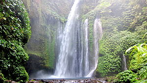 - π Air Terjun Sindang Gila (En. Slightly Crazy Waterfalls) (π Sendang Gile and Tiu Kelep Waterfalls Gate 1, π Sendang Gile and Tiu Kelep Waterfalls Gate 2). The best known and most spectacular of the three. The water cascades everywhere here breaking some 50 m above the main arrival point. From Senaru village walk about 20 minutes to the southeast. The path is pleasant and leads through some splendid tropical forest. Good to chill eat, few tables, else locals set on floor/path. Few stalls with basic stuff like instant noodles. Few shelters between gate 1 and this waterfall, none after. Foreigner Rp 20,000 (both Sindang Gila and Tiu Kelep).