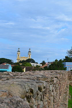 Our Lady of the Assumption church with a section of the Dom Pedro II Citadel wall in the foreground in Caçapava do Sul, Rio Grande do Sul.