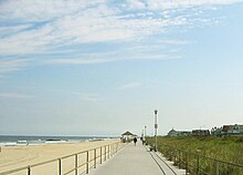 The Boardwalk is a two-mile elevated walking platform where entrances to the beach are blocked by badge checkers. The two pavilions (North & South) have bathrooms, food and tourist goods for sale.