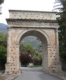 - π Arch of Augustus. Roman arch erected by a Romanized Sugusian chief to Augustus in 8-9 BC.