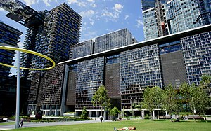 The Dr Chau Chak Wing Building - π The Goods Line and The Dr Chau Chak Wing Building. The Goods Line is a modern horizontal urban parkland similar to the 'High Line' in New York. The space occupies an unused section of a historic freight line that connected the ports near Darling Harbour to the main railway lines near Central Station. At the park you will find many skaters practicing their tricks and also students from the nearby University of Technology, Sydney. Next to the park is Dr Chau Chak Wing Building designed by Frank Gehry which is famous for resembling a scrunched up brown paper bag.