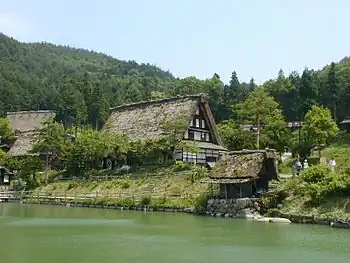 - 🌍 Hida Folk Village (飛騨民俗村 Hida Minzoku-mura, 飛騨の里 Hida no sato). An attractive open-air museum assembled from real buildings that effectively recreates an entire traditional mountain village. Artisans continue to work in many buildings; you can buy their crafts and even try your own hand at a number of activities. The architectural highlights are the traditional thatched-roof gasshō-zukuri houses, built with roofs like hands in prayer to withstand the heavy snowfalls in this region. More whimsically, there is a giant maneki-neko cat outside, standing over 4 m tall. ¥700 entry, or ¥930 for entry with bus ticket from and to JR Takayama Station.