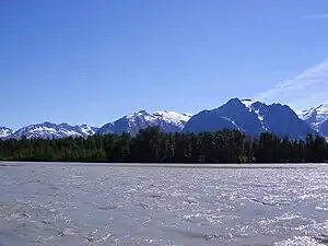 Below the mouth of the O’Connor River, the Tatshenshini is dramatically different. The river pours through a braided channel that is over a kilometre wide; expansive views of the glacier-covered St. Elias Ranges dominate the west. Here the coastal influence begins to be felt, while high winds and heavy snowpacks are common. Scientists studying the area say the mixed spruce-willow-birch forest found along this stretch of the river is unique in BC.