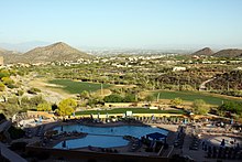 - 🌍 The Loews Ventana Canyon Resort, 7000 N Resort Dr (at the foot of the Santa Catalina Mountains), ☏ +1 520-299-2020, toll-free: +1-800-234-5117, fax: +1 520-299-6832, ventanareservations@loewshotels.com. There are a total of 398 rooms on three floors. There are two pools, five restaurants, a spa, running path, hiking trails, and there are many species of birds right outside your room on the side that looks out to the mountains. There are also two 18-hole golf courses nearby the hotel. There is free access to Sabino Canyon via a van; however, complimentary WiFi to their guests is not offered. Expect average daily rates for their standard rooms to cost $250 per night during the summer and convention seasons. Typically most guests are retirees without grandchildren - younger guests with children tend to stick out like a handful of sore thumbs.