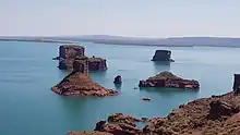 - 🌍 Picún Leufú. About 50 km south-west of El Chocón, a slightly larger (3500 inhabitants) but still quiet town in an oasis near the Ramos Mexia lake. There are several nice lake beaches at 10-15 km of the town reachable via regular dirt road (usable by normal cars, but drive slowly), but only one (the Club de Pesca) has infrastructure with toilets, shadow and a campground for a small fee. The town is pleasant and modern, it has several restaurants and shops and a small gas station. It's not touristy at all, but has several small hotels and apartment complexes, mostly for travellers on the way to Bariloche.
