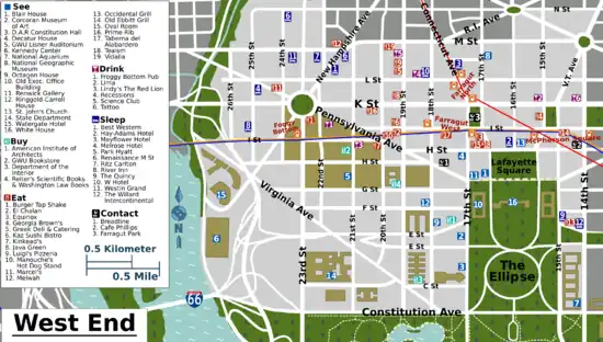 The West End of Downtown D.C. is the area immediately west of downtown. This guide focuses on the areas of K Street, the West End and Foggy Bottom neighborhoods. The White House and its grounds function as a barrier between the East End and the West End, with the 1600 block of Pennsylvania Ave closed to motorists. In the daytime, Lafayette Square and the block of Pennsylvania Ave are closed to motorists in front of the White House are popular with tourists and street hockey enthusiasts.